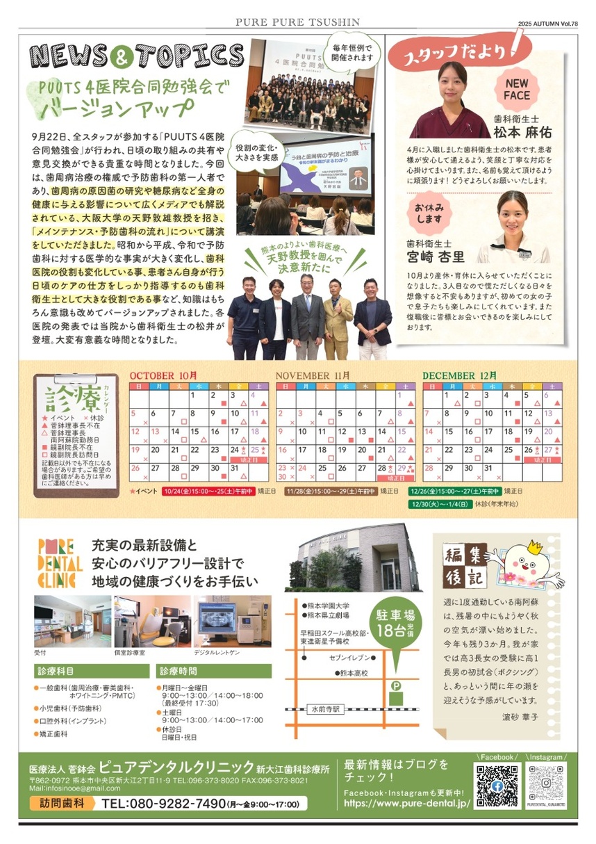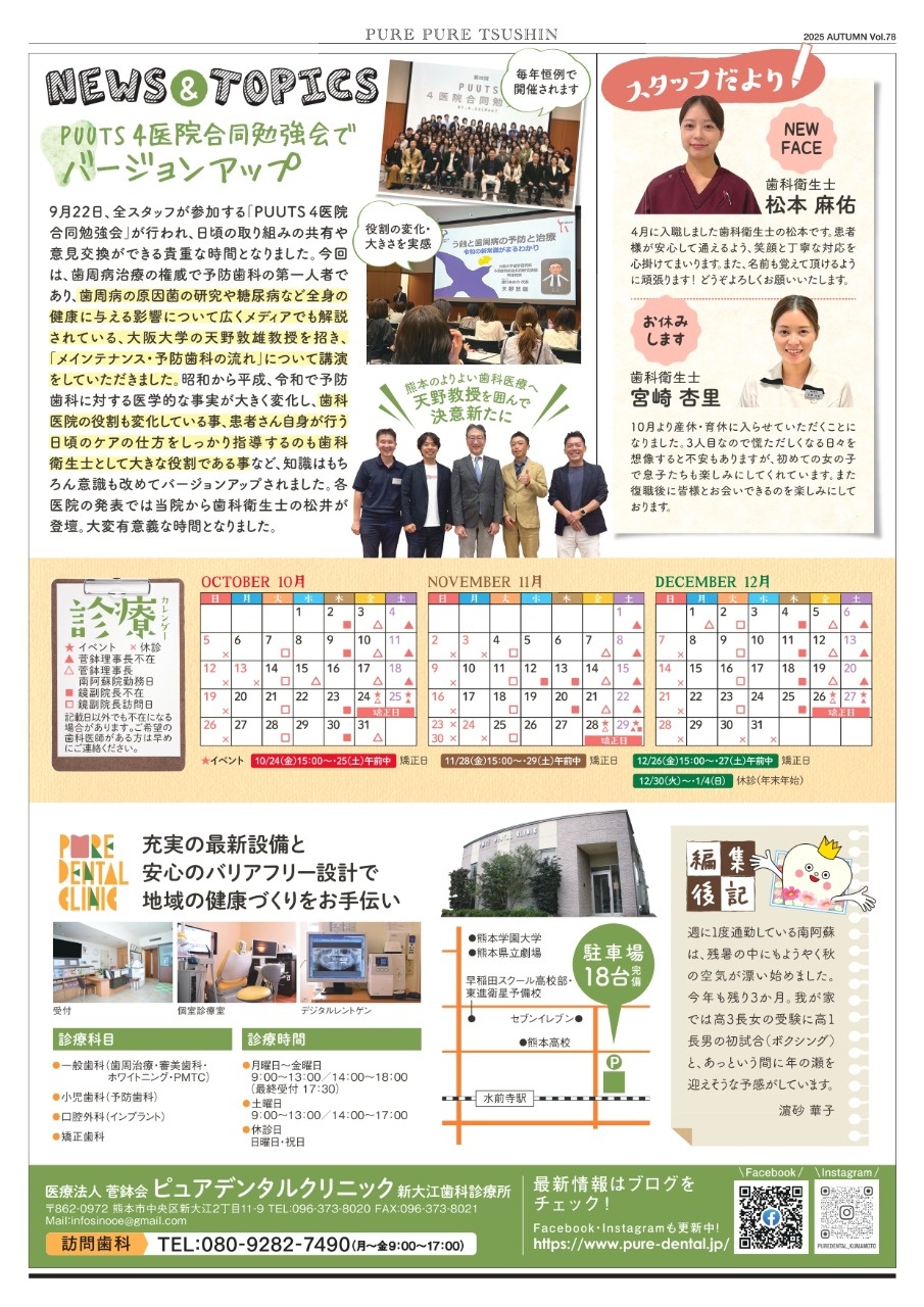 2025/10/02(木) 受付 ピュアピュア通信~vol.78~ こんにちは 10月に入り、すっかり秋らしくなってきましたね(^^)/ 朝晩の寒暖差が大きく、なんと今日は14度差の予報でした(+o+) 体調を崩しやすい時期なので気を付けたいと思います! さて、新しいピュアピュア通信が完成しました☆ 今回は。1周年を迎えた南阿蘇院や 先日行われたPUUTS勉強会の様子など♪ 受付にてお配りしておりますのでご覧ください( ^^) _~~~~