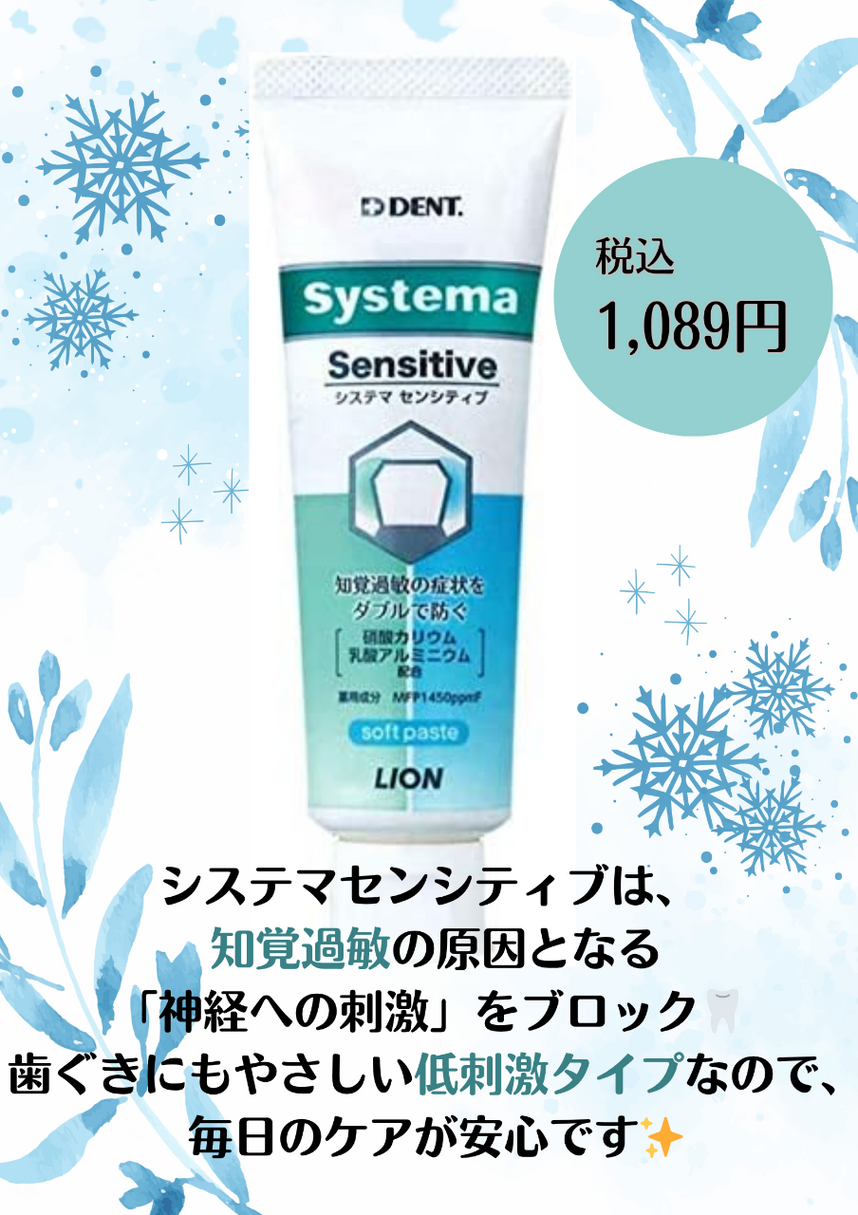 2025/11/08(土) 受付 NEW 雑貨コーナーが秋冬仕様になりました こんにちは。ピュアデンタルクリニック受付の宮﨑です。 11月になり、ピュアデンタルクリニックの雑貨コーナーも秋冬バージョンに模様替えしました。 あたたかみのあるディスプレイで、季節の変化を感じていただけるようになっています✨ 今月のおすすめアイテムは 「システマ センシティブ」 知覚過敏が気になる方にぴったりの歯みがき剤で、しみる刺激をやさしくケアします! ご来院の際は、ぜひ新しい雑貨コーナーをのぞいてみてください^o^