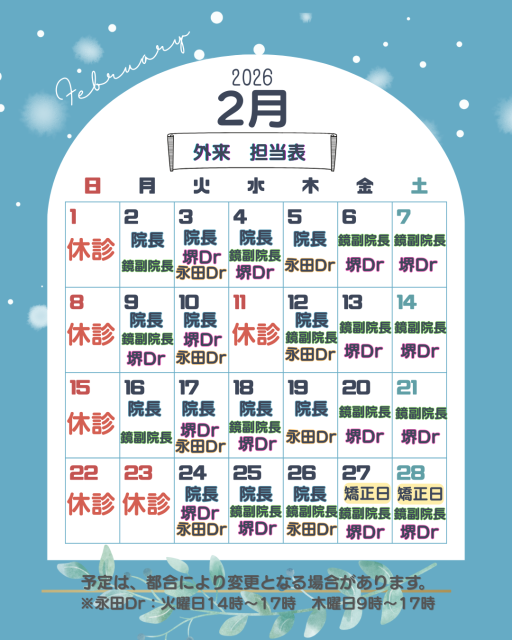 2026/01/21(水) 受付 NEW 2月の予定・休診日 こんにちは! ピュアデンタルクリニック新大江歯科診療所です(^^♪ 2026年2月予定は以下の通りです。 外来担当医予定表を掲載しておりますが、担当医や診療時間は状況により変更となる場合がございます。 あらかじめご了承ください。 どうぞよろしくお願いいたします!